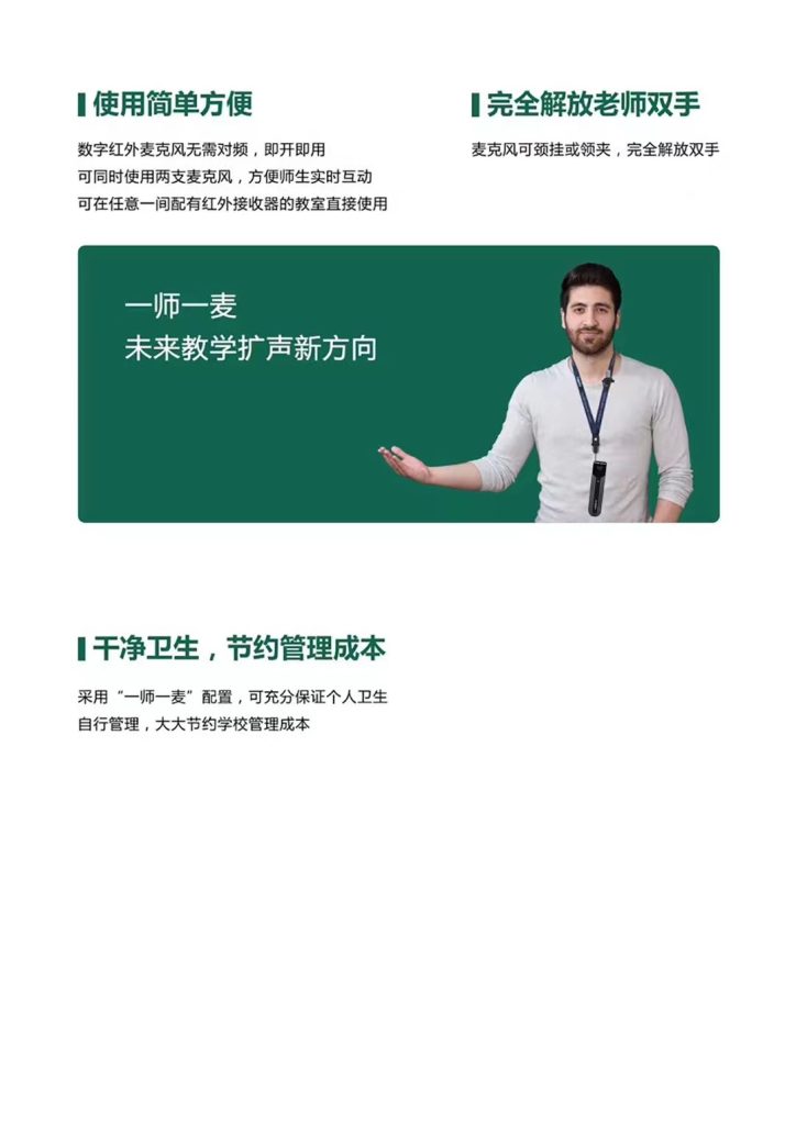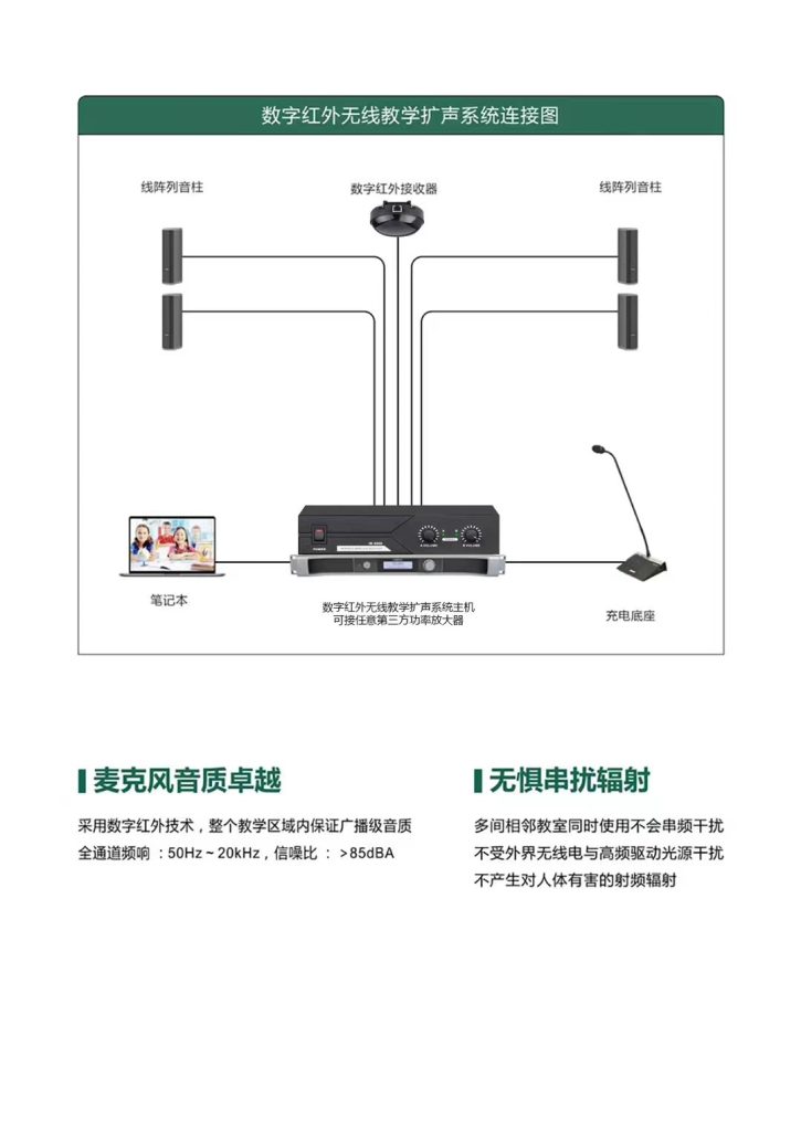 数字红外无线麦克风教学系统融合了红外无线传输与数字音频技术,为教育信息化提供了安全、稳定、高保真的语音解决方案,是构建现代化智慧教学环境的重要组成部分。